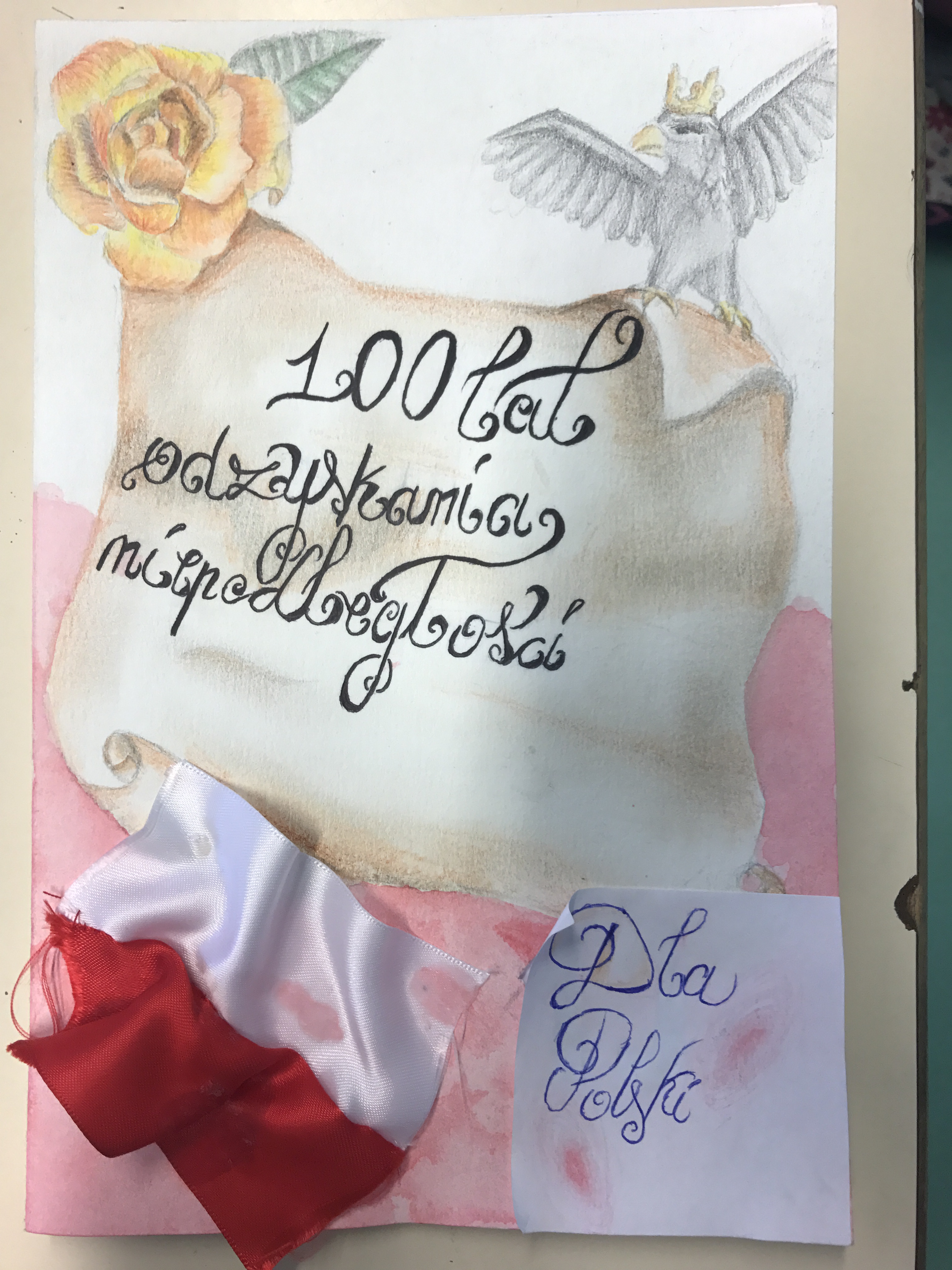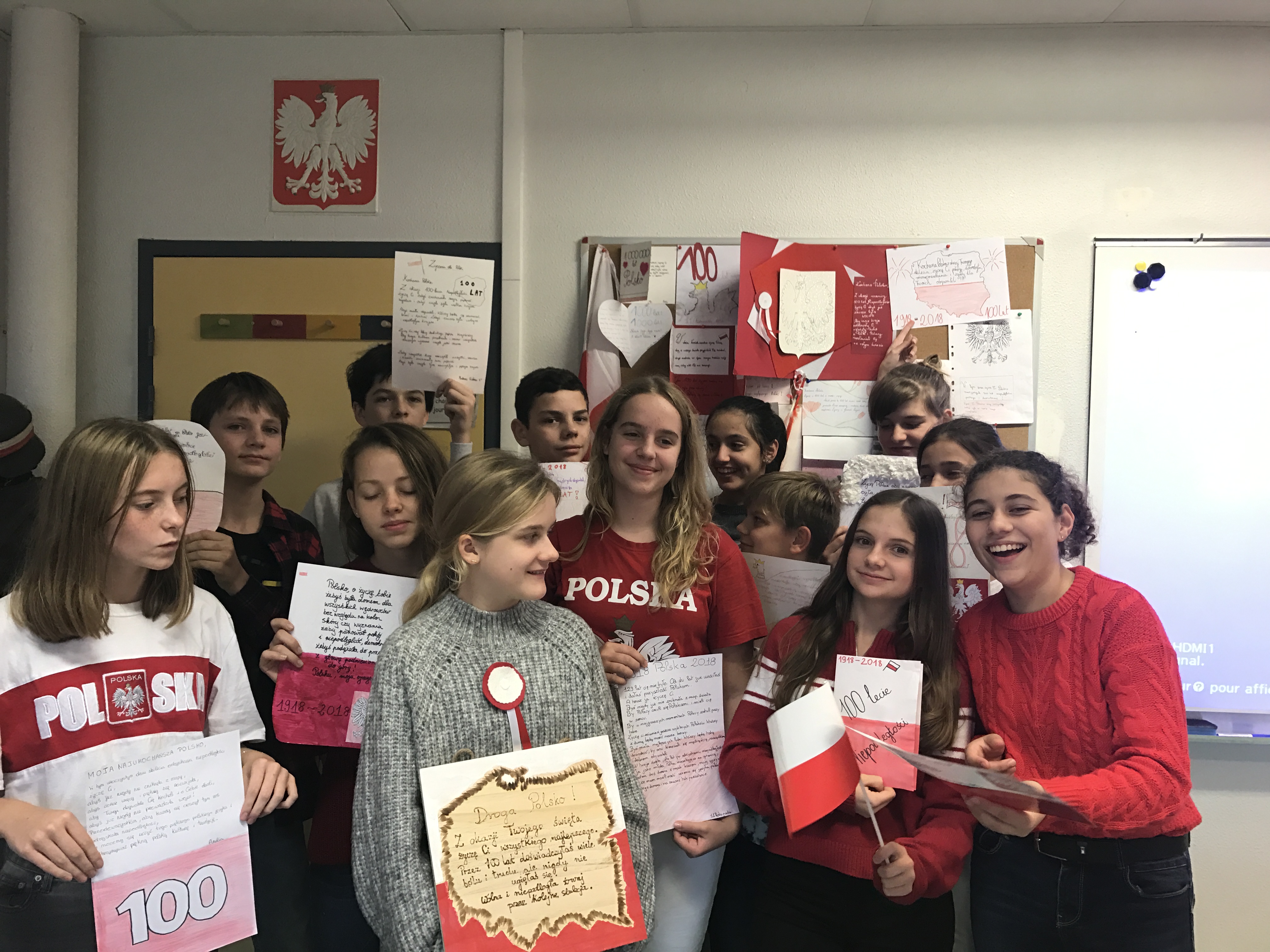 Dla naszej Niepodległej uczniowie klasy 5ème i 4ème przygotowali piękne laurki z radosnymi i szczerymi życzeniami na kolejne stulecia, zaś kl.3ème nagrała video-życzenia.