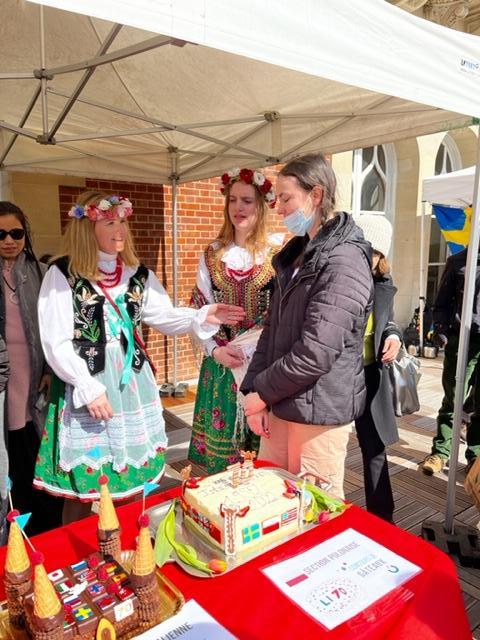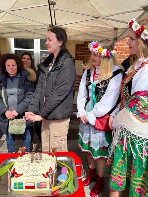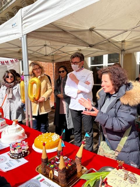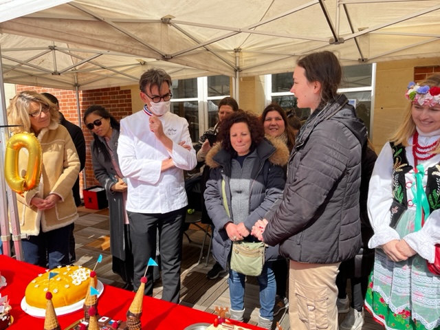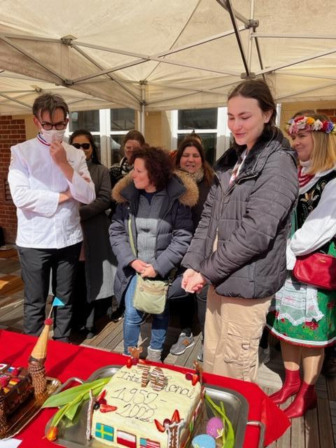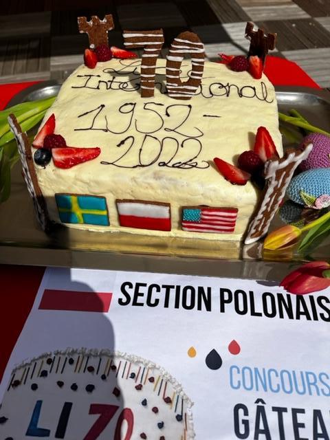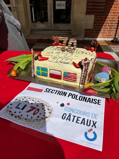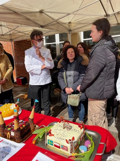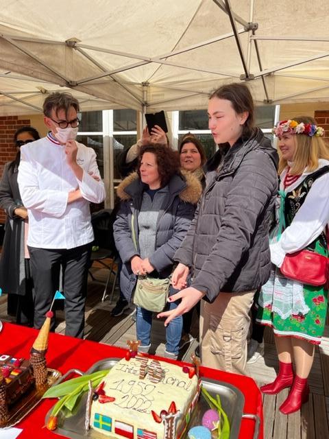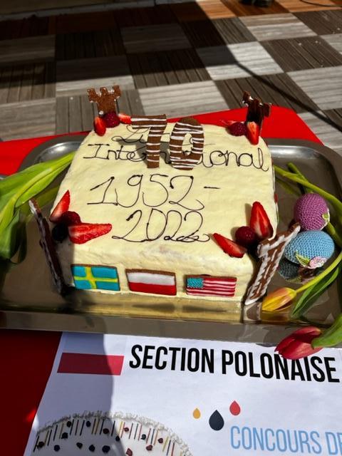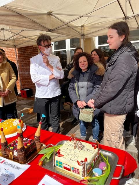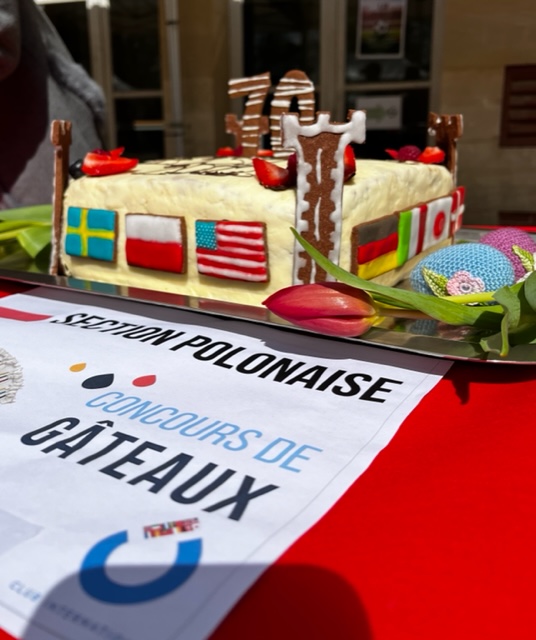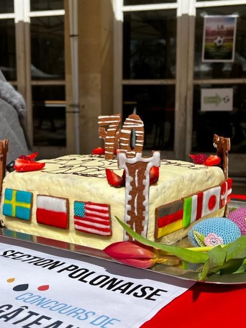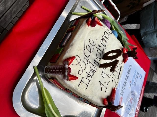 I już pewnie Państwo myślicie, że to koniec… Nie… Mamy kolejną niespodziankę – tzw. „wisienkę na torcie” (w sensie dosłownym), ponieważ to były wyjątkowe obchody – 70-lecie liceum, każda sekcja została poproszona o przygotowanie ciasta. Były one oceniane przez znanego szefa cukiernika Guya Krenzera. My zwróciliśmy się z prośbą do naszej maturzystki Mariny, która przygotowała prawdziwą cukierniczą perełkę. Przepiękny tort, który wspaniale ujął idee liceum międzynarodowego i reprezentował Sekcję. Marino jesteś naszym zwycięzcą i w imieniu Stowarzyszenia składam Ci moje wyrazy uznania i wielkie brawa!!!